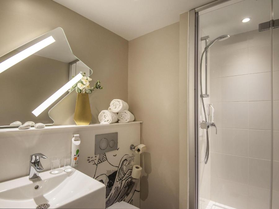 The rooms are spread over several floors, serviced by an elevator. They feature air conditioning, comfortable bedding, and private bathrooms with showers. A flat-screen TV and high-speed Wi-Fi complete the standard amenities. The layout remains minimal but well-organized, with integrated storage and a bright ambiance.