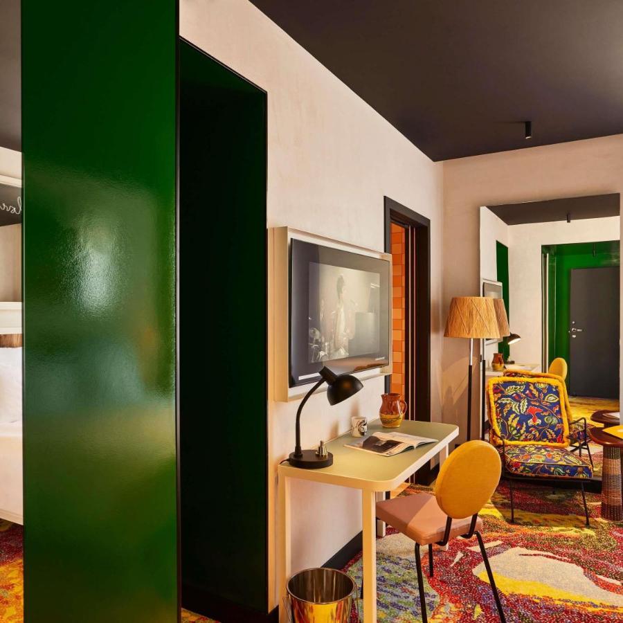 The 102 rooms combine comfort, originality, and functionality. Various formats are available, from the "small" room designed for solo stays to modular configurations suitable for family or group trips. Each room stands out with its joyfully colorful decor, carpets with playful patterns, and walls adorned with artistic touches. Five-star bedding ensures restful sleep, while the bathrooms, tiled in vintage pink, feature organic, solid toiletries that are gentle on both skin and the environment.