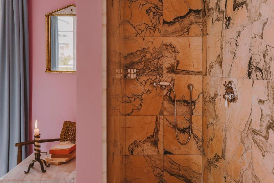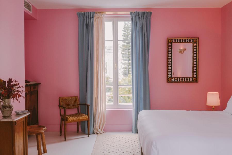 La décoration affiche une cohérence élégante, faite de marbre rose, de laiton patiné, de bois exotiques et de textiles épais. Dans les chambres, pas d’écran, pas de téléphone, mais une radio rétro et une ambiance qui repose sur la lumière, le silence, et quelques notes choisies. Certaines disposent d’un balcon, d’autres même d’une douche extérieure, comme un luxe inattendu sur les toits de Nice. Le studio, au dernier étage, offre un espace généreux, baigné de clarté, prolongé par une terrasse intime.