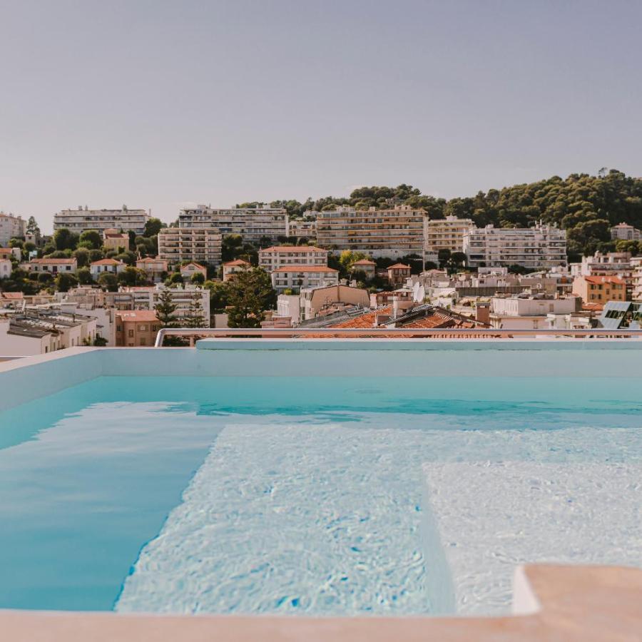 Si les chambres offrent un refuge, les espaces communs prolongent cette sensation d’abri urbain. Le patio végétalisé diffuse une fraîcheur bienvenue les jours d’été. Le bar, ouvert jusqu’à tard dans la nuit, invite aux échanges ou aux instants suspendus. Quant au rooftop, il offre une parenthèse au-dessus de la ville, avec piscine, transats et vue dégagée sur les toits de la Riviera. Le rythme y est libre, la détente naturelle.