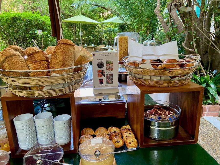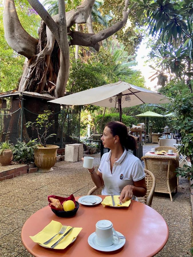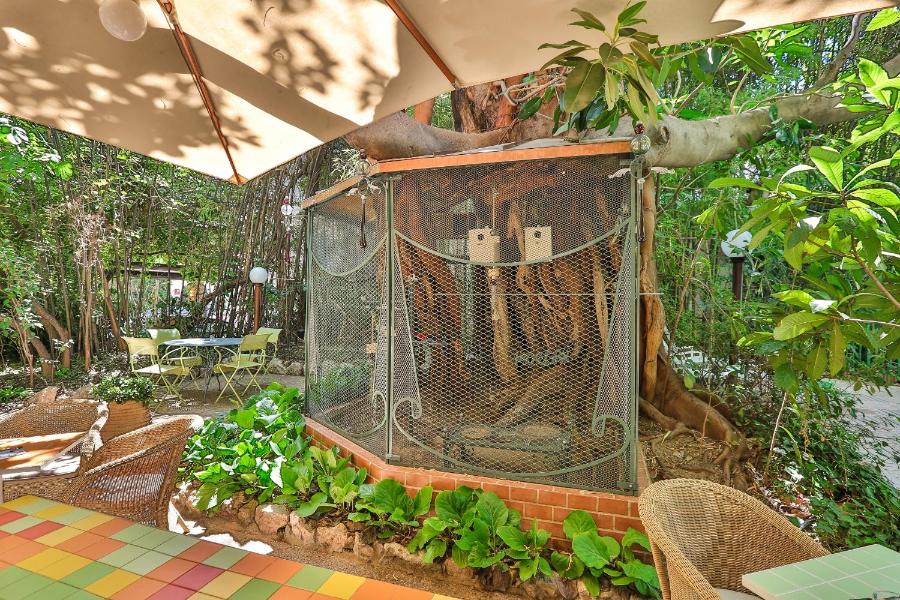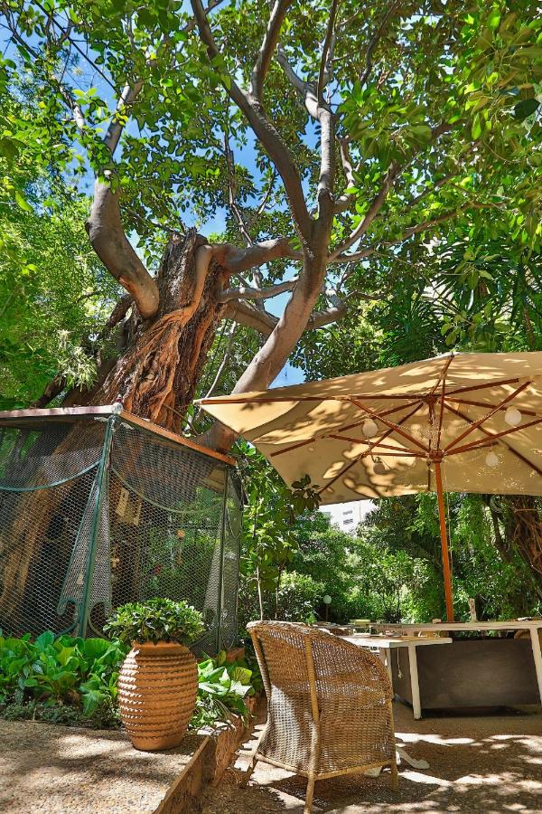 Le jardin constitue sans doute l’un des points forts les plus inattendus de l’établissement. Véritable refuge au cœur de la ville, il rassemble citronniers, bambous, bougainvilliers et essences exotiques autour d’un majestueux caoutchouc, sous lequel il fait bon s’asseoir. Une volière pensée par un artiste vient ajouter une touche de poésie sonore, mêlant chants d’oiseaux résidents et passages furtifs du vivant.