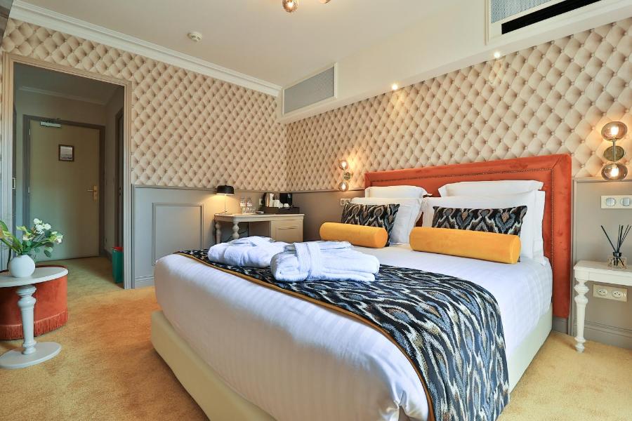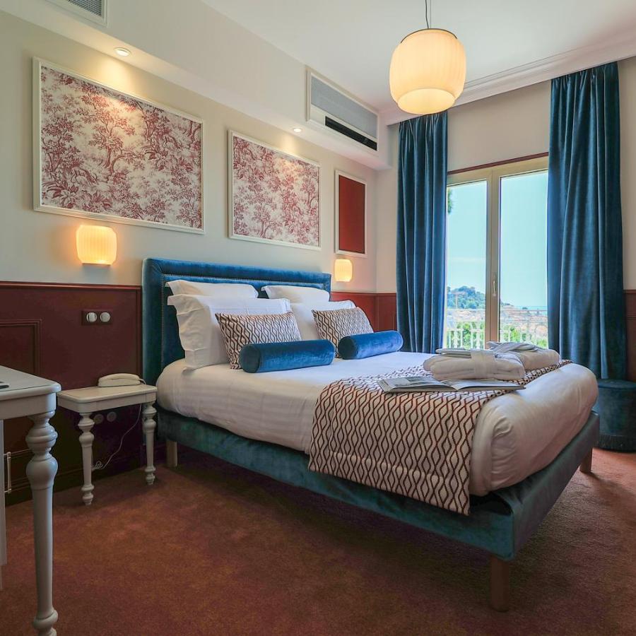Les chambres sont décorées avec goût, dans un style qui mêle harmonieusement douceur des tissus, papiers peints délicats et mobilier choisi. Certaines disposent d’une terrasse aménagée ou d’une vue dégagée sur les toits du Vieux Nice, voire sur la Baie des Anges. À l’intérieur, les équipements sont pensés pour votre confort : climatisation individuelle, literie de qualité, télévision à écran plat, minibar, coffre-fort, plateau de courtoisie et produits d’accueil dans la salle de bain, signés L’Occitane.
