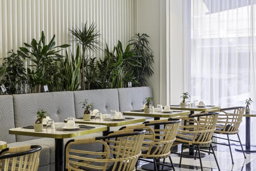 Dans le hall, un coin salon permet de lire la presse, d’utiliser un ordinateur mis à disposition ou de savourer un café. Après 10h30, thé et café restent accessibles en libre-service. Le bar de l’hôtel, avec ses touches végétales et sa structure en marbre, invite à faire une pause dans la journée, autour d’un rafraîchissement ou d’un cocktail du moment.