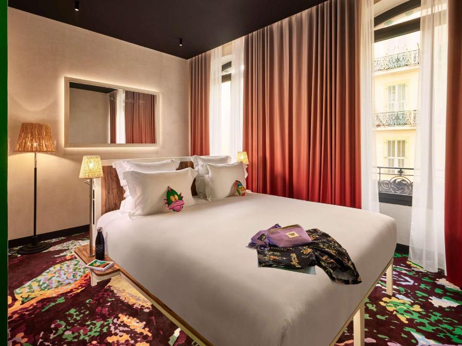 L’universo visivo dell’hotel rende omaggio alla cultura artistica locale. I riferimenti a Matisse, Picasso o alla Scuola di Nizza dialogano con opere contemporanee e una palette cromatica mediterranea. Ogni spazio comune, dalla hall ai corridoi, coltiva questa dimensione creativa con umorismo e generosità. È questa combinazione di spirito libero e attenzione al comfort che definisce il carattere unico di questo stabilimento.